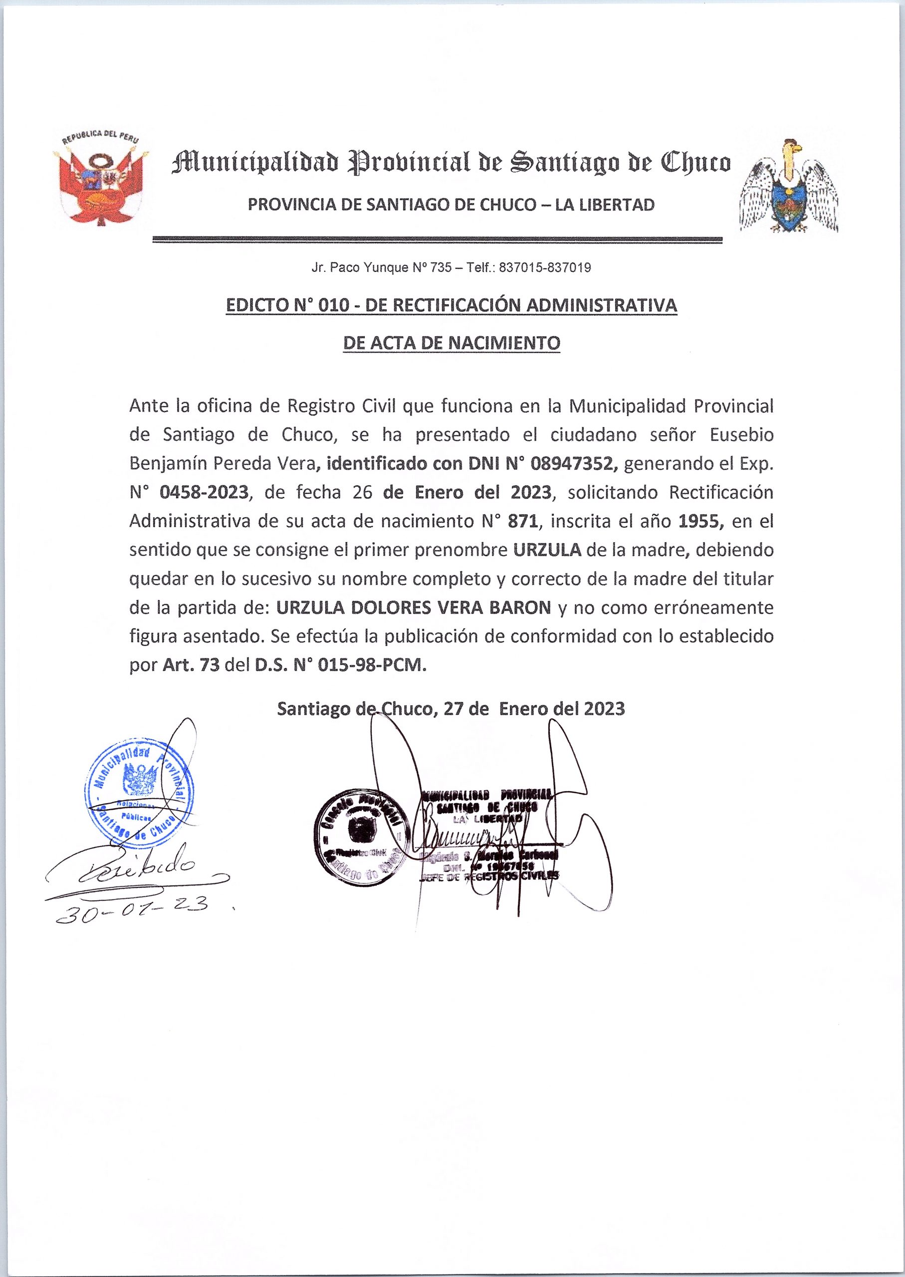 SE HA PRESENTADO EL CIUDADANO SEÑOR EUSEBIO BENJAMÍN PEREDA VERA, IDENTIFICACIÓN CON DNI N° 08947352, GENERANDO EL EXP. N° 0458-2023, DE FECHA 26 DE ENERO DEL 2023, SOLICOTANDO RECTIFICACIÓN ADMINISTRATIVA DE SU ACTA DE NACIMIENTO N° 871, INSCRITA EN EL AÑO 1955.